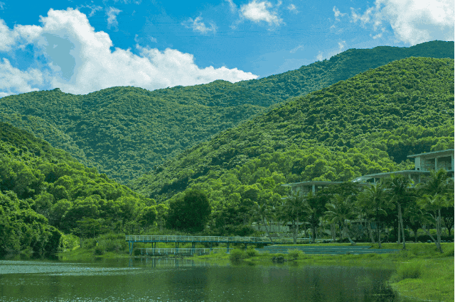 园区背靠白石岭群山雨林,私享朗阔蓝月湖,山环水抱,藏风聚气,玉带环腰,以水作佩,以风为裳,可谓是三亚的人居福地。