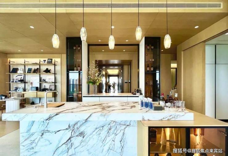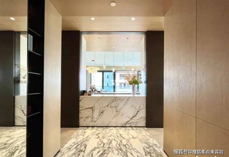 推开入户门,迎面而来是大理石吧台,不仅可以用作空间隔断,还能保护业主隐私。