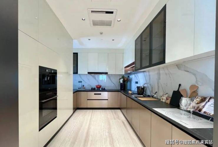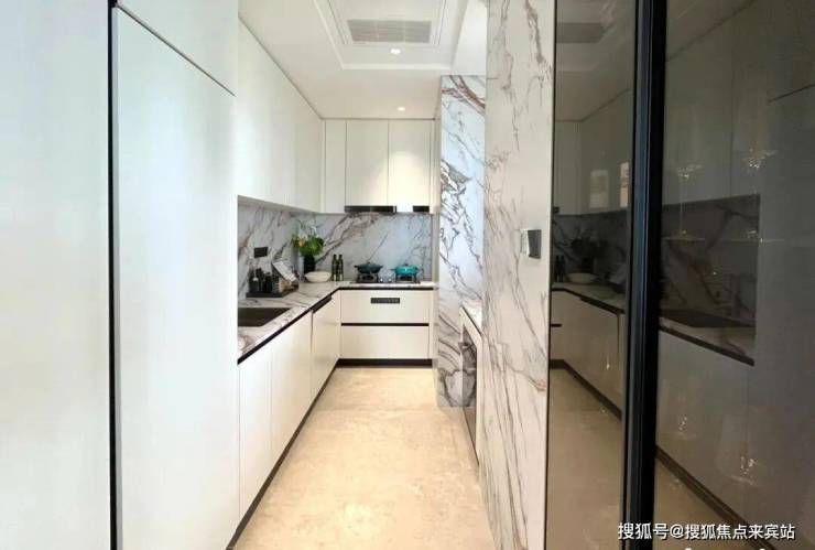 吧台旁是L型厨房,通体黑白色+大理石的设计,让空间更明亮通透、简洁大方。