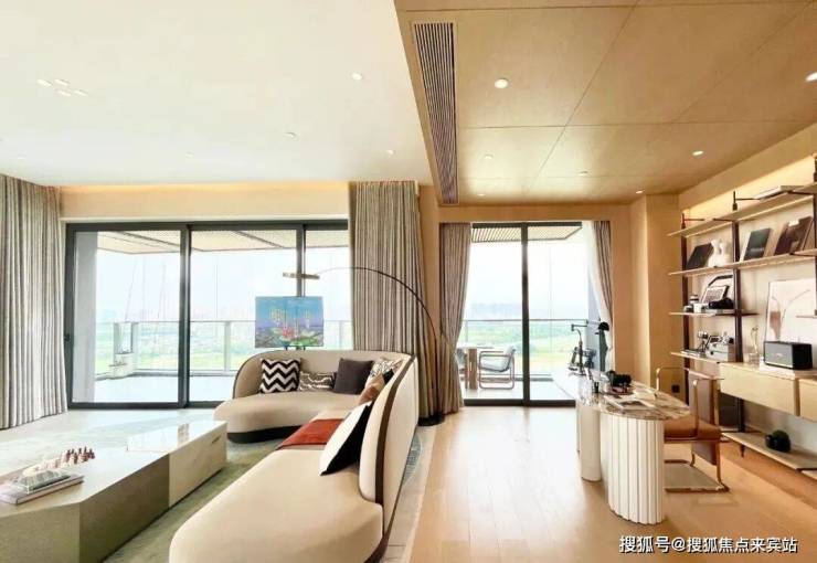 而位于吧台和书房前的近100㎡会客厅,被320°U型大阳台包围住,加上全落地窗的设计,空间尺度、景观视野拉到最大。