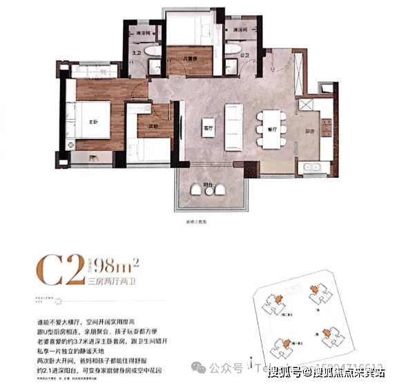 98平方米的3房2厅2卫户型,设计为横厅格局,南北通透,L型厨房,主卧双飘窗通透设计。