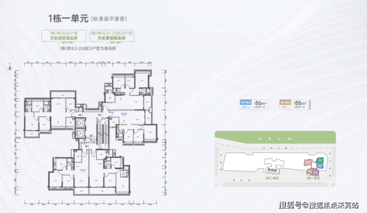 共由2栋31层高的住宅组成,分别是1栋1/2单元,另外2栋规划1所写字楼32层,跟小区是分开管理的,不共享花园,总规划261户,其中商品房229套,人才房32套,1栋2单元2梯4户,1栋1单元2梯5户设计。