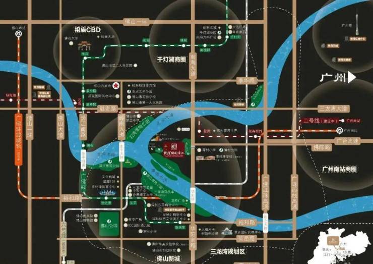 佛山2号线地铁上盖、30分钟接驳广州:项目坐享三龙湾规划建设的“九横九纵”干线道,路网,及佛山新城基本形成的“三纵五横”成熟路网(三横:广明高速、佛陈路、魁奇路;五纵:佛山一环、广珠西线、南海大道、岭南大道、汾江路)。项目约800米即达2号线登州站,6站可接驳广州,实现30分钟广佛都市通勤圈,1小时通达大湾区主要城市核心区。