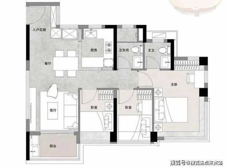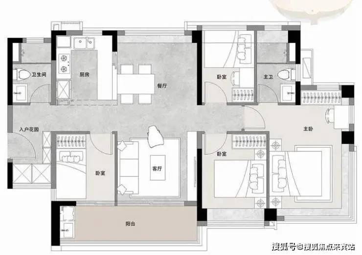 建面约68㎡的户型,做到3空间2卫、南向4开间,户型领先市场太多了。