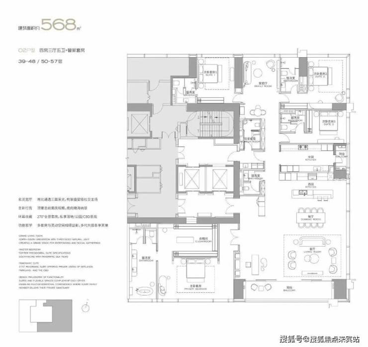 南北通透三面采光,顶奢总统套房规格,270°全景套房,享受湿地/公园/CBD景观,都是套房设计,更具私密性,中西厨分离。