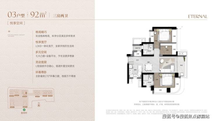 户型采用新规设计,通过弹性方厅、多飘窗等实现90%+使用率
