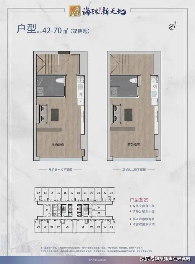 海珠新天地是一栋27层单体楼,其中1-4层是商业配套,6-24层是复式产品,25-27层是平层产品,总供货525套。