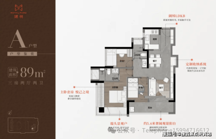 89㎡三房有横厅和双阳台两种布局可选,主卧带双面凸窗;