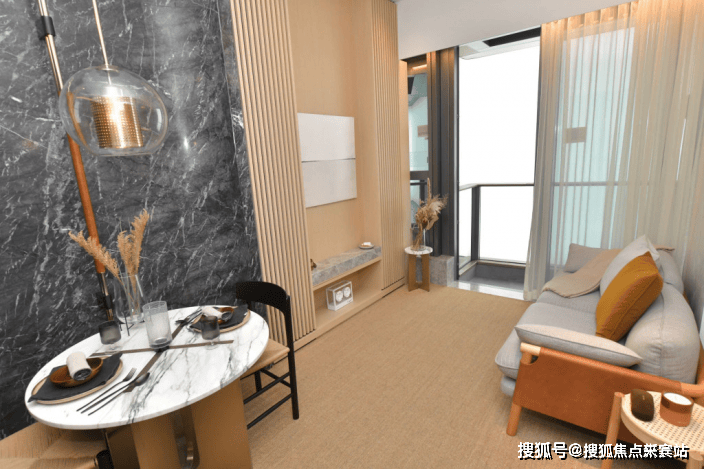长形的客饭厅空间宽敞,间隔实用,整体设计优雅,以浅木色墙壁装饰配黑色大理石,营造出低调奢华的感觉。客饭厅相连露台,大大增加采亮度及通风。