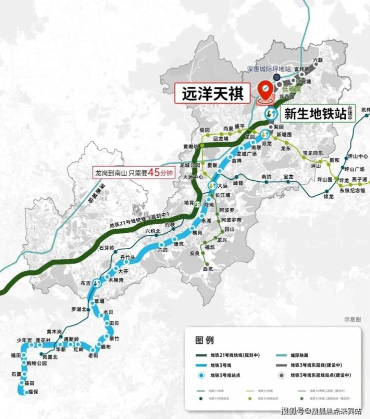 远洋天祺距离地铁3号线东延线和21号快线双轨交汇“新生站”直线距离仅约500米,是片区离地铁最近的在售项目,未来还有深惠城际前海保税区至坪地段,全长58公里,时速160公里/小时,以后从项目到南山、前海也很方便快捷。