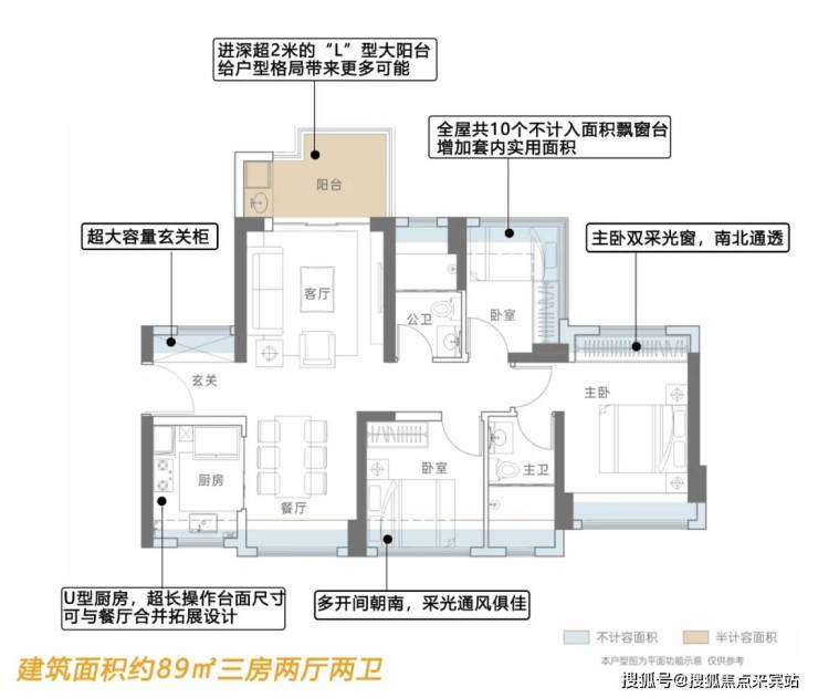建筑面积约89㎡户型,有10个飘窗;LDKB一体化设计。U型厨房,动线短且方便,还贴心预留双开门冰箱位;主卧套房设计,并且实现了南北通透,次卧与公卫也可以组成类套房,三代人同住也能保证各自的独立空间。