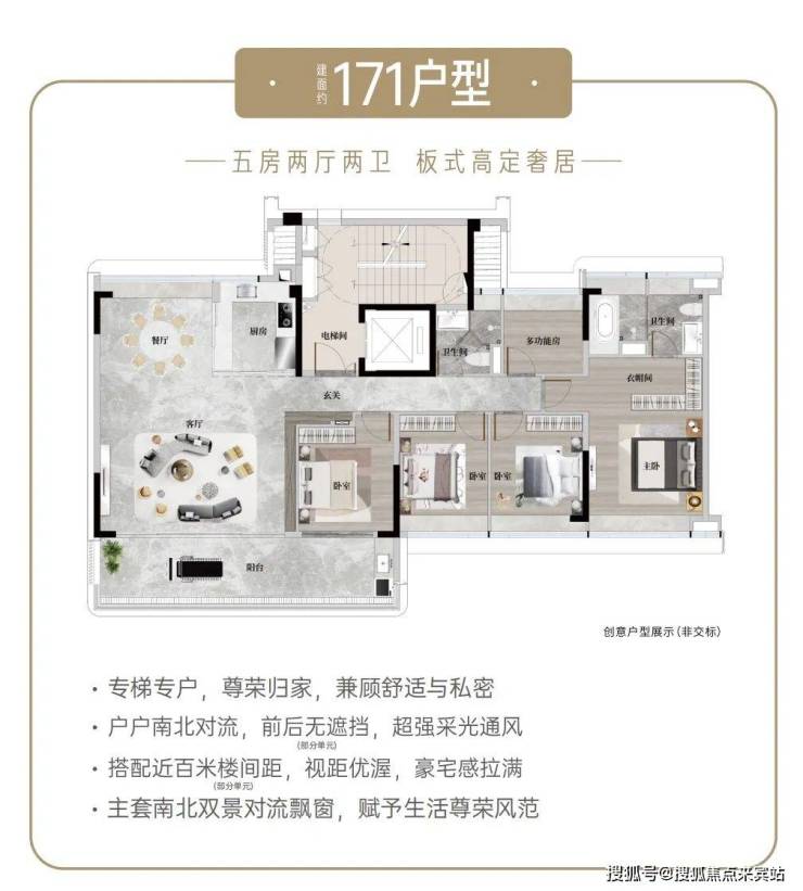 ◎沁润心灵的超感产品:全社区专梯到户四至五房奢居产品,大面宽、大进深、纯南向专梯到户奢宅