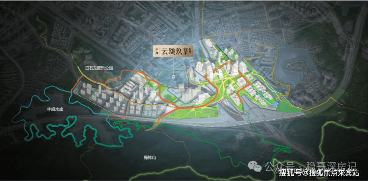 项目位于深圳龙华区民治街道新区大道与金龙路交汇处东南侧,地处梅林关门户位置,也是龙华区新增的七大重点片区之一,该片区定位为"大湾区数字经济核心引领区、数字科创先锋示范区",是深圳中轴线上的战略要地。项目周边群山环绕,生态价值优越,距离玉龙滨水主题公园、星河雅宝山体公园等城市公园仅数百米,形成了"城在山中、山在城中"的生态格局。