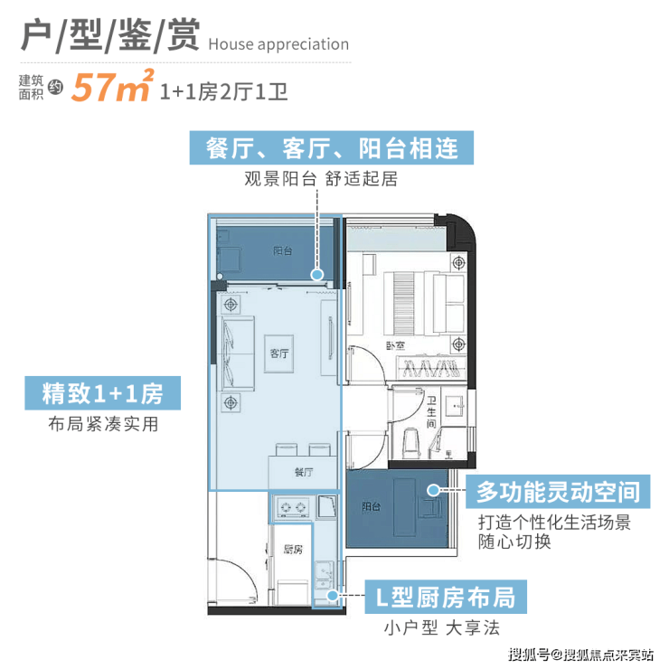建面约57㎡的精致1+1房,餐厅、客厅和阳台相连的设计,增加了空间的通透感,减少了小户型的压抑感。