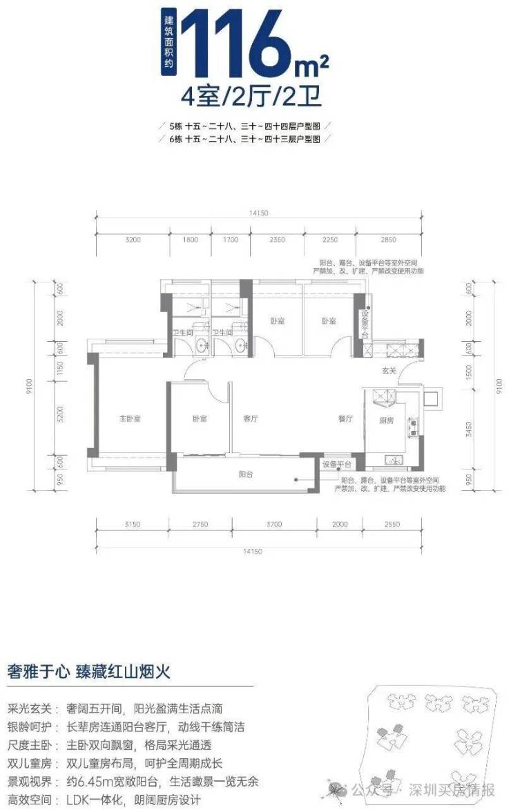 116㎡的4房2厅2卫,折后总价704-848万/套,单价6.06-7.31万/㎡。