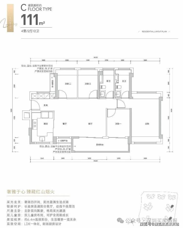 深业颐樾府占地约2.6万㎡,总建面约18.65万㎡,计容建筑面积约14.1万㎡,容积率5.2,绿化率40.01%,共由7栋总高30-46F的住宅组成,其中1栋1单元企业自持租赁住房32F,1栋2单元公租房31F,1栋3单元公租房30F,2/3栋商品房32F,5栋商品房46F,6栋商品房45F,4栋是1所6班制幼儿园,以及部分底商和公交首末站等公共配套。 项目采用C型围合布局,外墙为铝板山墙+真石漆+涂料,2梯6户、3梯6户,户户朝南。