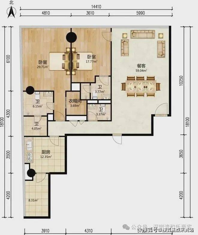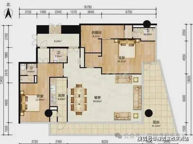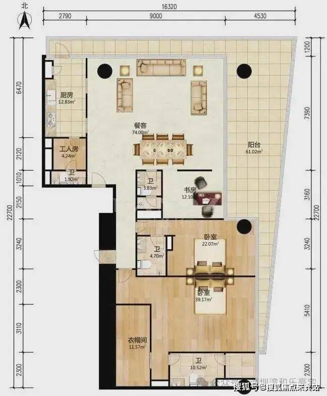5-19层,202㎡,2房2厅2卫,朝西北,得房率,76.43%。