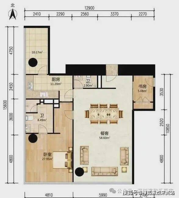 优点:3.45米极限层高,主卧双向景观面,静谧书房及6米客厅开间,餐客一体。