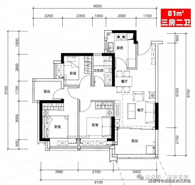 H01户型:81㎡三房二厅二卫