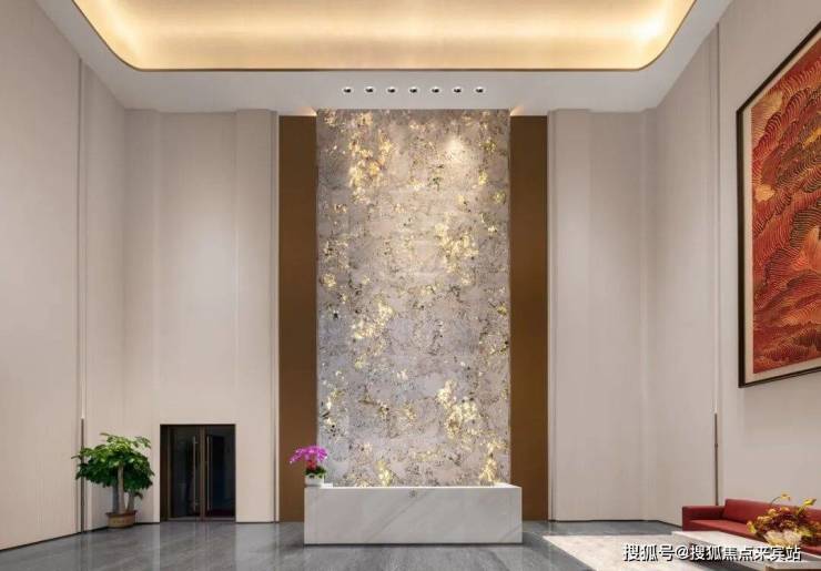 从社区主入口的酒店式归家大堂开始,体验便不同凡响。意大利宝格丽奢石接待台、巴西潘多拉透光奢石背景墙、约9米挑高的弧顶艺术涂料天花板与牡丹油画挂画,共同营造出入户的尊崇仪式感。两侧对植的约20年树龄造型冬青,以盎然生机寓意“基业长青”,仪式感与归属感自此油然而生。