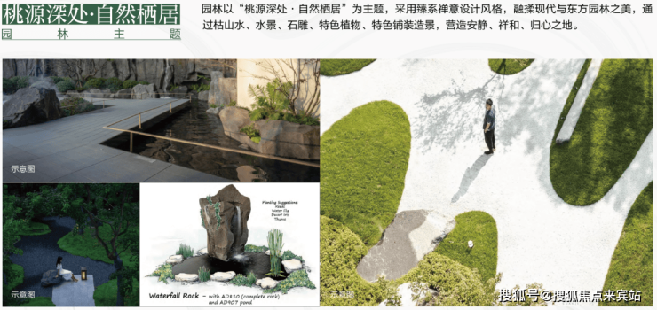 以“桃源深处·自然栖居”为主题,融揉现代与东方园林之美,通过枯山水、水景、石雕、特色植被造景,打造世外桃源的景观。