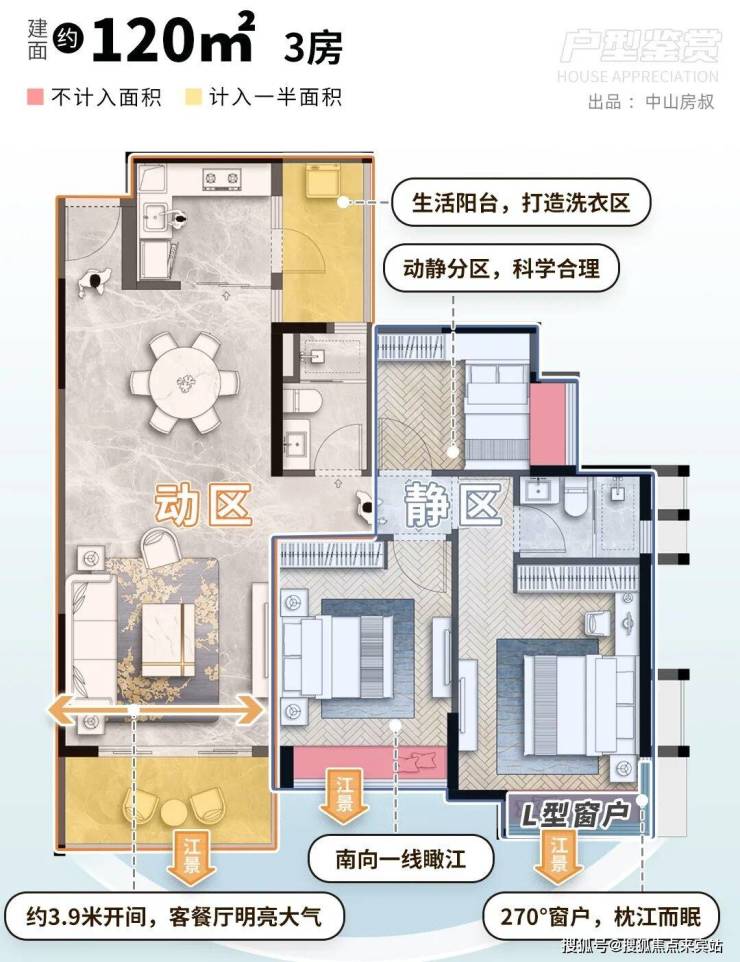 建面约125㎡3+1房,则做到「把江景当成家的一部分」。