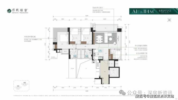 114㎡的4房2厅2卫,设计的是横厅格局,独立专梯入户,送约10㎡的私用公区,客餐厅6.8米开间,主卧270°无柱转角飘窗,赠送1个约1.6㎡设备平台,4个卧室分别做到了主卧20.6㎡/次卧10.45㎡/次卧10.45㎡/次卧7.12㎡(包含墙体飘窗),客餐厅出6米长的观景大阳台,东北朝向看新安中学。套内面积89.48㎡+赠送24.92㎡=实用面积114.4㎡,加上得房率约99.32%。