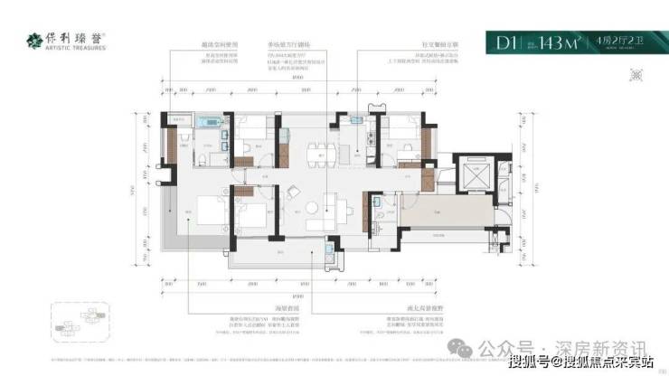 143㎡的4房2厅2卫,D1户型(03),设计的是竖厅南北通透格局,独立专梯入户,送约12㎡的私用公区,客厅5.7米开间,四开间朝南,4个卧室分别做到了主卧28.2㎡/次卧9.38㎡/次卧9.24㎡次卧9.2㎡(包含墙体飘窗),客厅连接次卧出6.5米长的瞰海大阳台,西南朝向看海景。套内面积111.7㎡+赠送29.8㎡=实用面积141.5㎡,加上得房率约98.41%。