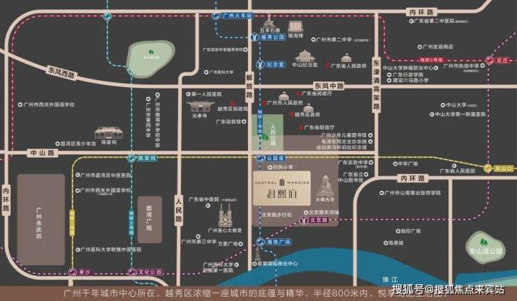 项目坐落于承载南越国文明、近代革命风云及现代省市行政中心的千年中轴上,是广州文化根脉与政务中枢所在。1公里范围内省级、市级机关单位高度集中,形成独特的高浓度政务文化氛围与稀缺的高端圈层。