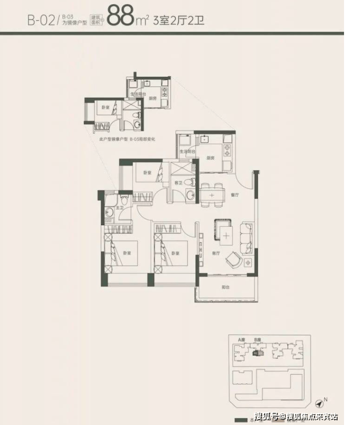 位于1B座是两梯四户的格局,尺度感不亚于目前市面上95㎡的产品。