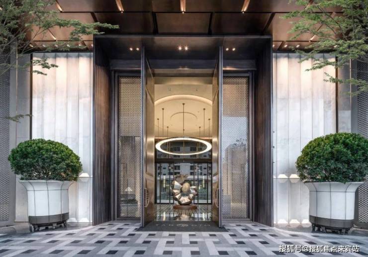 穿过极具领域感的界面,就来到了近 400㎡的环岛前庭。这里的每一处细节都彰显着奢华,超 5000 块厚 5 公分、三种不同纹理的花岗岩方石铺地,两座定制款名贵海浪灰奢石门柱,中心处的发光玉石圆盘,还有那棵超百年树龄的古桩铁冬青,四季常青,寓意美好,每一处都让人忍不住驻足欣赏。