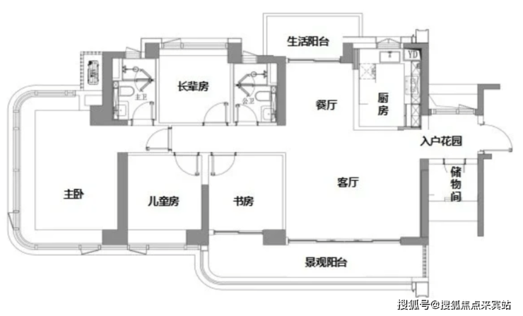 143㎡四房两卫:空间更加阔绰,生活阳台与景观阳台相呼应,增加了空间的通透感。主卧套房设计,配备独立卫生间和储物间,保障主人的私密性和舒适性。