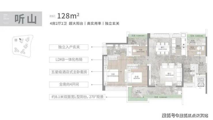 建面108平3+1房,四开间朝南,近6米的南向阳台,270度景观,LDKB一体化设计,5.9米的大方厅,奢阔大主套设计,配置南向大飘窗,独立卫浴,L型衣帽间