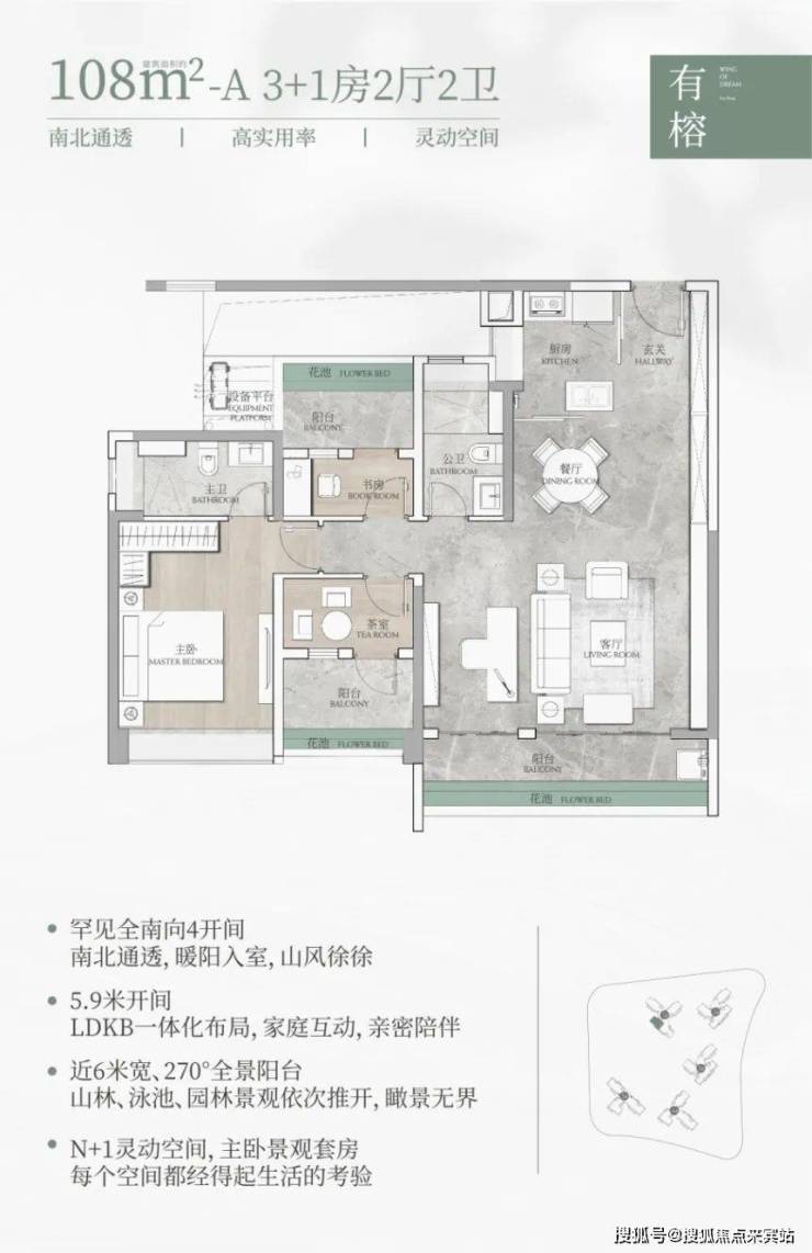 108㎡的三房户型,配备近 6 米的 270° 观景阳台,采用 LDKB 一体化设计,客厅空间显得十分宽敞通透;