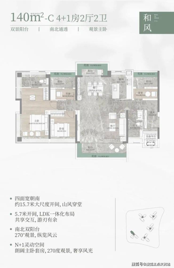 140㎡的户型,主卧实现三面采光,270° 环幕观景,并且是双套房设计;