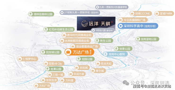 项目规划了9班幼儿园(建设中),和配置有36班九年一贯制书香学府、东兴外国语学校,更是临近全龙岗排名第三的“魔法高中”科高龙岗分校,涵盖了从小学到高中的12年全周期学制,实力学府雄厚师资。