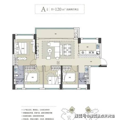 120㎡四房两卫户型:采用横厅设计,拥有一个11.4米的超大阳台,观景视野辽阔,且去除了竖厅必备的走廊,空间利用率更高。