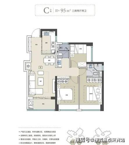 95㎡三房两卫户型:与75㎡户型设计理念相似,拥有开阔灵活的LDKB餐客厅,两个卧室与阳台同侧,均为南向,采光充足。