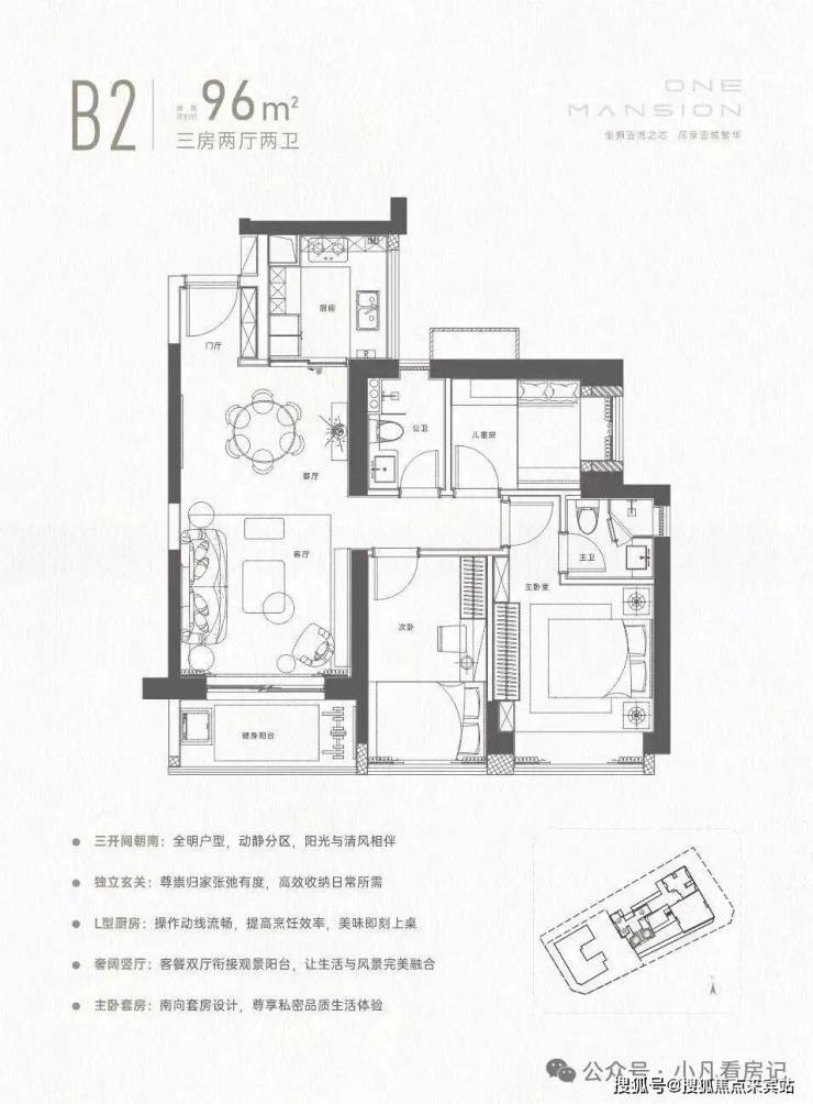 设计的经典竖厅格局,客厅3.6米开间,餐客厅一体化设计三开间朝南,3个卧室分别做到了3.3米/2.9米/2.7米的宽度,L型厨房,得房率72.47%(不含赠送),东南朝向。