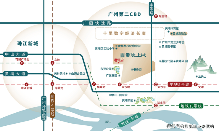 项目距5号线大沙地站仅约600米,2站到三溪,8站到珠江新城。且距黄埔高铁站约2公里,规划10台25线,通达湾区9城,来往上海/北京等。