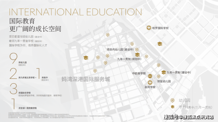 项目周边拥有15所幼儿园、4所义务教育学校,还有荔湾小学和深大附中等学校都在周边。此外项目靠近多所国际学校,拥有3000到5000个名额,包括荟同国际学校、礼德国际学校、英国国王学校(深圳分校)以及深圳哈罗国际学校。临近小区南侧有一块九年制教育用地,但目前未招标。入住早期可能要到妈湾南二外学校或者前湾南二外学校上学。