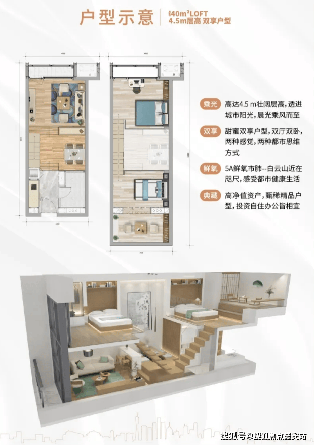 观成大楼:建筑面积约为31-57平方米的中轴资产,合理规划卧室、厨房、卫生间,4.5米高超高空间,中空挑高设计,打造大House体验。