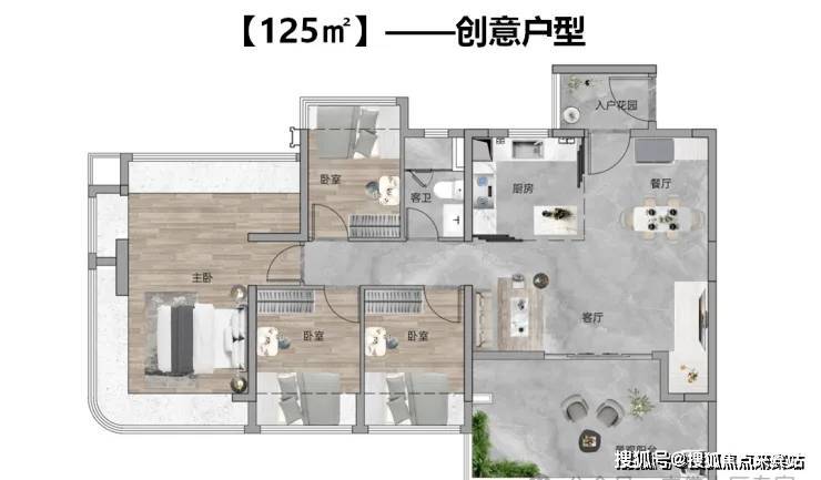 明星户型推荐🔝 【80㎡三房2厅2卫】东南向, 使用率107%,四开间南向,12.6米超大面宽,主卧270°弧形玻璃幕窗。