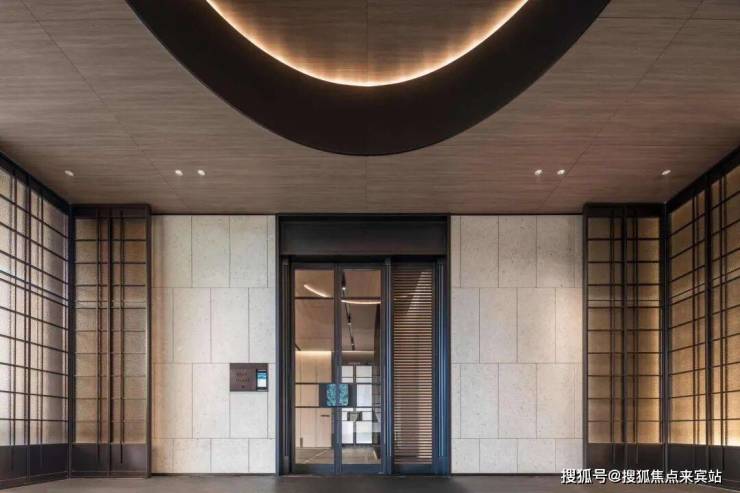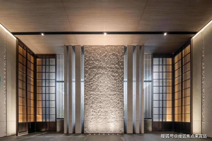 入户大堂纯粹简约,遵从着独属自身的美学秩序,营造归家礼仪,匹配层峯世家的气度与格局。整体以黑白石材打底,描绘干净高级的空间基调。地面石材的深浅拼花肌理变化,有层次细节但不显得刻意做作。大堂主背景采用大幅毛面贝金米黄,粗犷中透露着雕塑般的力量感,让整个大堂不失气势。两侧墙面也有对应的小幅肌理延续,同时也与天花造型相对应。围合的金属屏风则为空间增加了秩序的围合与包裹,搭配柔和的壁灯,勾勒出精致高雅的空间美学。