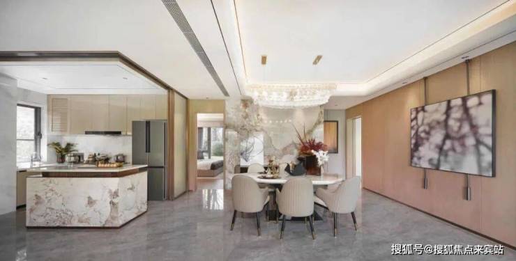 只见源于土耳其的爱马仕灰大理石通铺整个大厅,天花吊顶也是通铺,另外还有松下新风系统和大金中央空调,以及华为全屋智能家居,交楼标准可谓顶豪顶配。