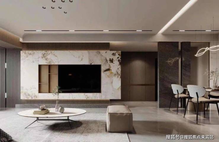 电视背景墙采用西班牙进口的宝格丽纹奢贵岩板设计,墙面则采用汤臣一品同款的木饰面,使空间焕发出永恒的魅力。