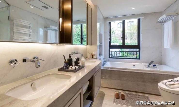 主卫的面积约 12 ㎡,采用了豪华的六件套配置,卫生间地面均采用土耳其进口的爱马仕灰石材,墙面整体采用了西班牙进口岩板,洗手台及浴缸台面采用意大利进口大花白石材,整个空间色调淡雅质感奢华,纹理若隐若现,自带一种返璞归真的艺术气质。