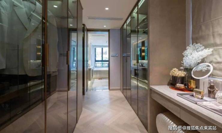 非常值得一提的是,作为交付标准的可单可双的超大衣帽间,整个空间可以隔开成为双衣帽间,分别满足男女主人各自的生活习惯和收纳需求,中间还放置了一个中岛饰品柜,放置一些女主人收藏的珠宝首饰,也可以作为男主人的手表手带的收藏展示,既实用又浪漫。
