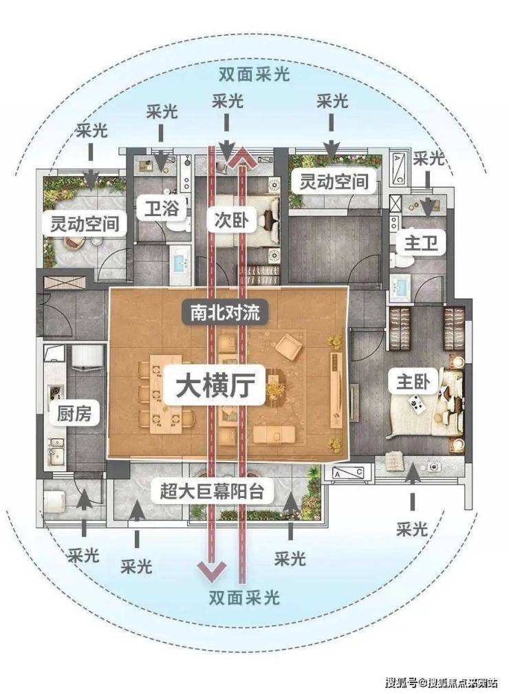 也有建面约117平横厅3+1户型设计,餐客厅采用横厅一体化设计,减少过道的同时,把开间大大延伸至与景观阳台同宽。