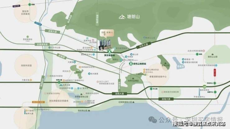 项目地址位于深圳市南山区桃源北环大道北侧塘朗山南麓,邻近深云地铁站。项目大体被山体包裹,西侧和南侧分别临近南坪快速路、北环大道两条城市快速路,其东侧还将建设侨城东路北沿线(建设中),所处片区相对割裂存在。